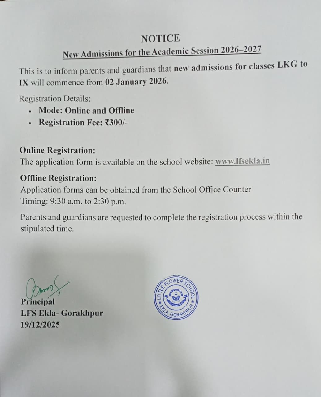 We are pleased to inform all parents and guardians that admissions for classes LKG to Class IX will begin from 02 January 2026.
